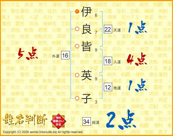 伊(6画)良(7画)皆(9画) 英(9画)子(3画)