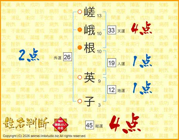 嵯(13画)峨(10画)根(10画) 英(9画)子(3画)