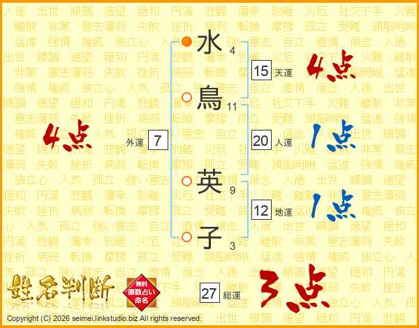 水(4画)鳥(11画) 英(9画)子(3画)