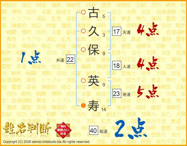 古(5画)久(3画)保(9画) 英(9画)寿(14画)