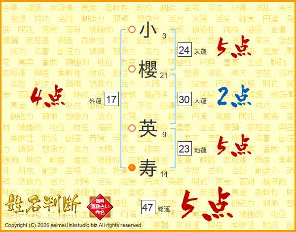 小(3画)櫻(21画) 英(9画)寿(14画)