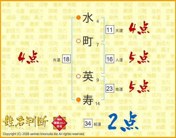 水(4画)町(7画) 英(9画)寿(14画)