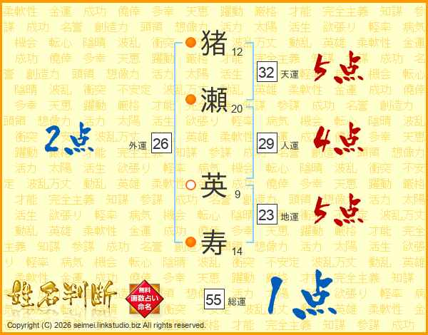 猪(12画)瀬(20画) 英(9画)寿(14画)