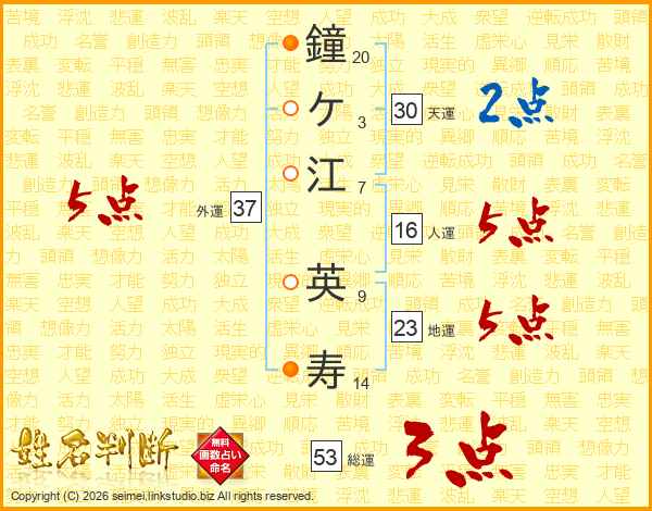 鐘(20画)ケ(3画)江(7画) 英(9画)寿(14画)
