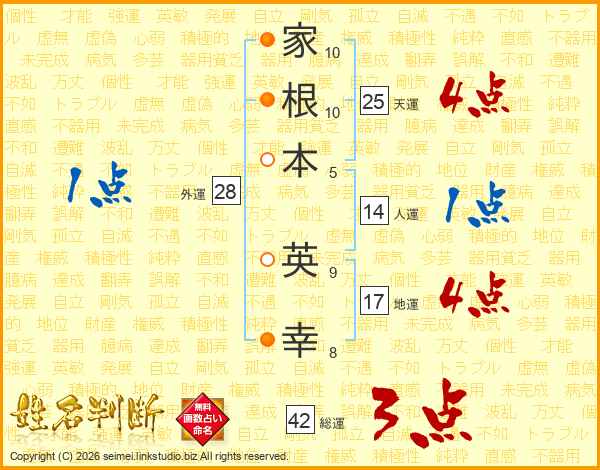 家(10画)根(10画)本(5画) 英(9画)幸(8画)