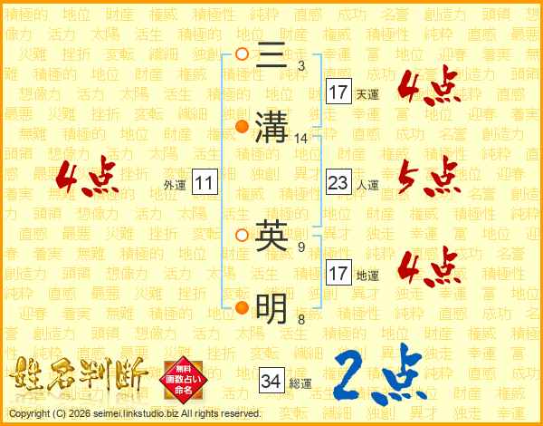 あなたの人生を表す1番重要な運勢です。生涯を通じて影響する総合運となり、主に50歳以降の晩年期に影響を及ぼします。苗字と名前の合計画数。
