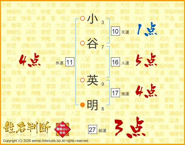 生活面を象徴する運勢です。外部から受ける影響力を表し、結婚運、家庭運や職場、環境への順応性を表します。総運から人運を引いた画数。姓や名が1文字の場合を除く。