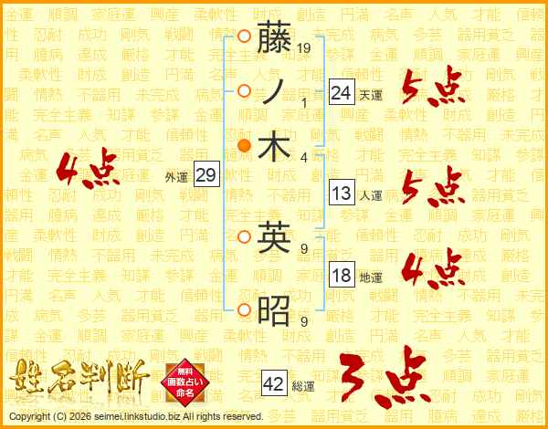 藤(19画)ノ(1画)木(4画) 英(9画)昭(9画)