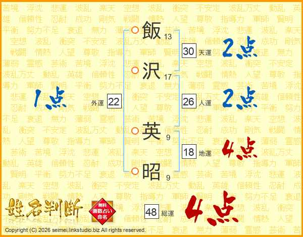 飯沢英昭さんの人運は26画の2点!