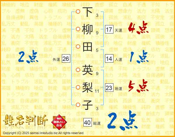 下(3画)柳(9画)田(5画) 英(9画)梨(11画)子(3画)