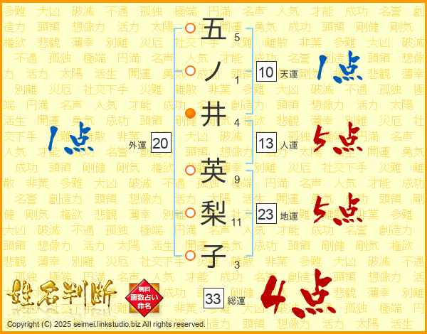 五(5画)ノ(1画)井(4画) 英(9画)梨(11画)子(3画)