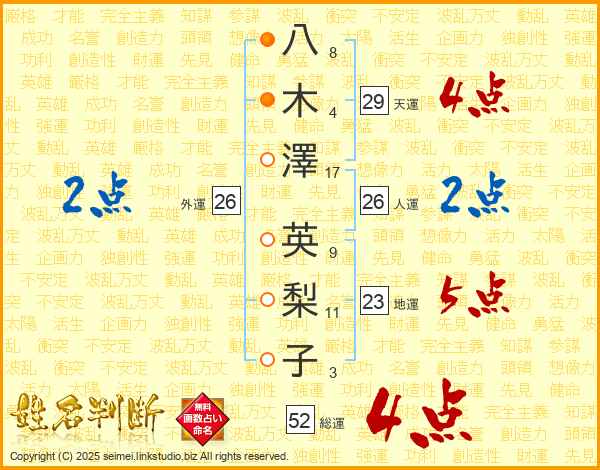 八(8画)木(4画)澤(17画) 英(9画)梨(11画)子(3画)