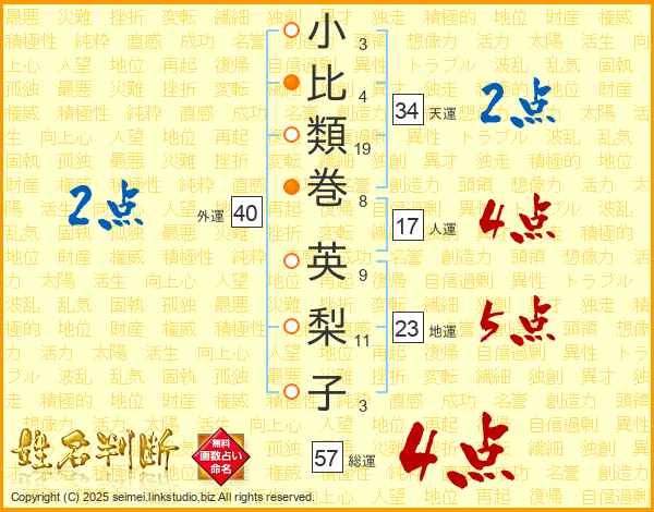小(3画)比(4画)類(19画)巻(8画) 英(9画)梨(11画)子(3画)