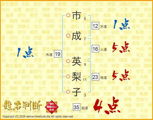 市(5画)成(7画) 英(9画)梨(11画)子(3画)