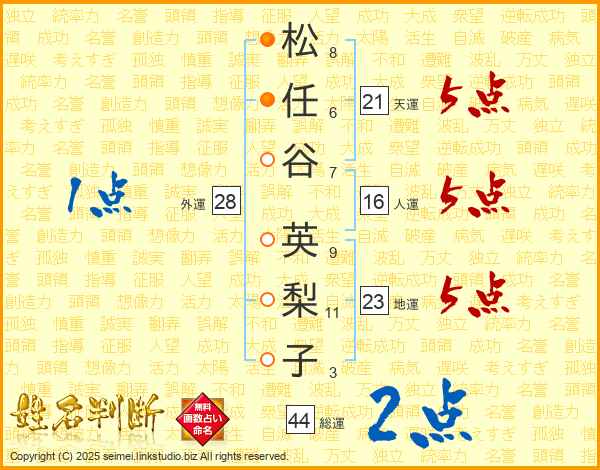 松(8画)任(6画)谷(7画) 英(9画)梨(11画)子(3画)