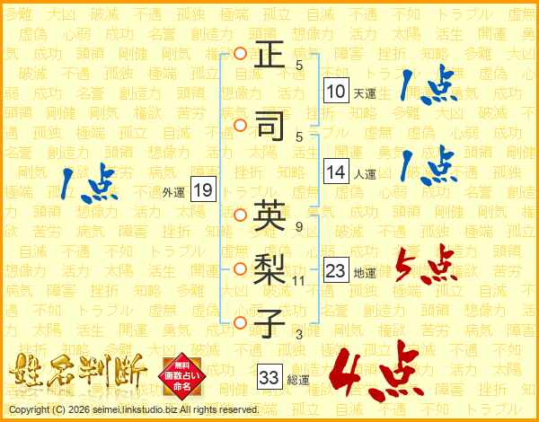 正(5画)司(5画) 英(9画)梨(11画)子(3画)