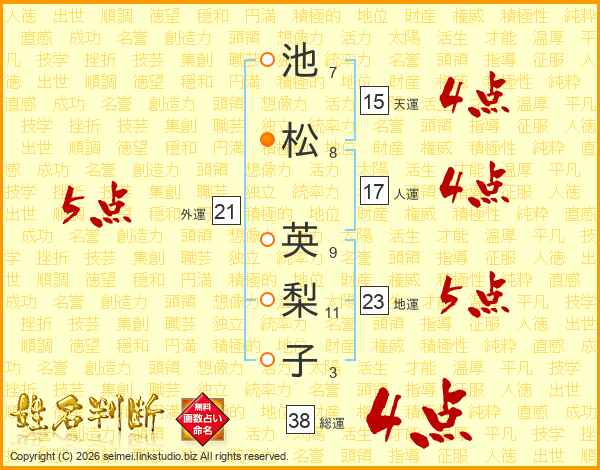 池(7画)松(8画) 英(9画)梨(11画)子(3画)