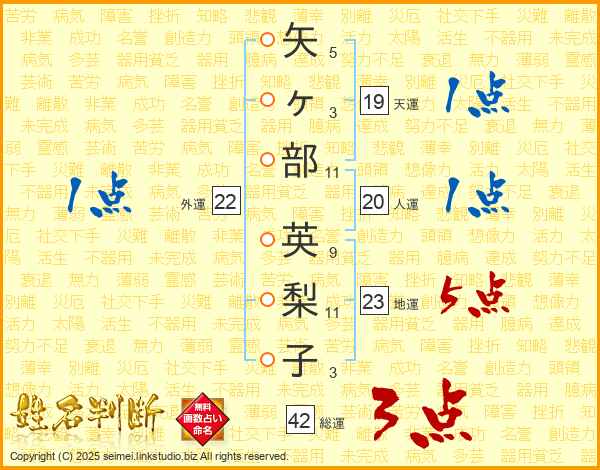 矢(5画)ヶ(3画)部(11画) 英(9画)梨(11画)子(3画)