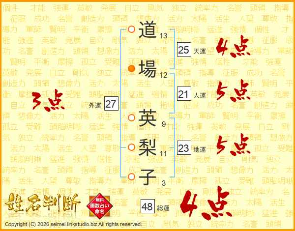 道(13画)場(12画) 英(9画)梨(11画)子(3画)