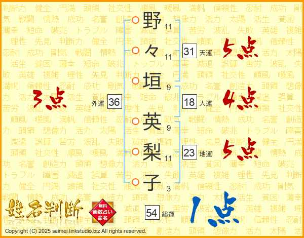 野(11画)々(11画)垣(9画) 英(9画)梨(11画)子(3画)