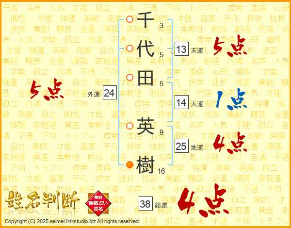 千(3画)代(5画)田(5画) 英(9画)樹(16画)
