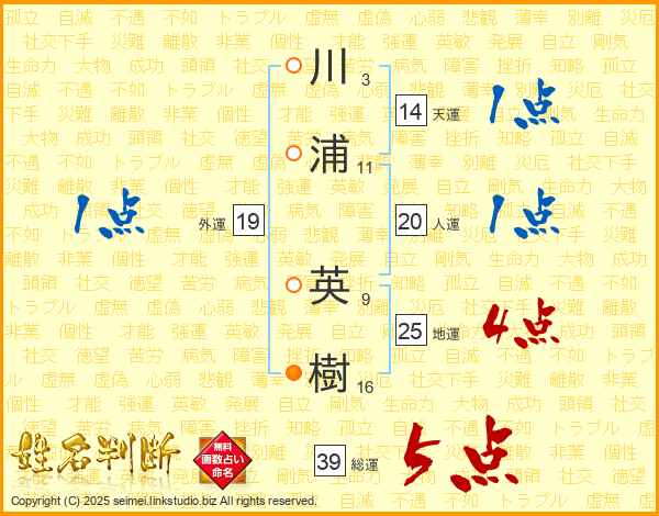 川(3画)浦(11画) 英(9画)樹(16画)