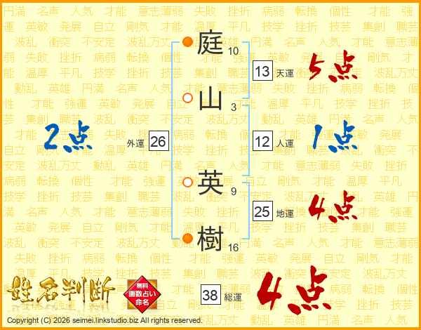 庭(10画)山(3画) 英(9画)樹(16画)