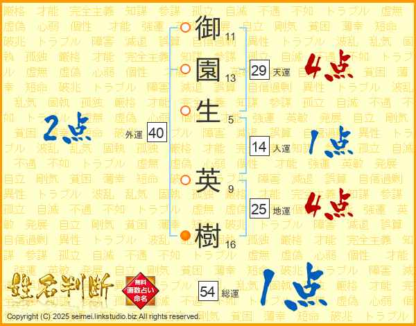 御(11画)園(13画)生(5画) 英(9画)樹(16画)