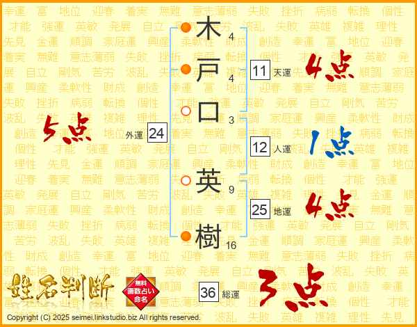 木(4画)戸(4画)口(3画) 英(9画)樹(16画)