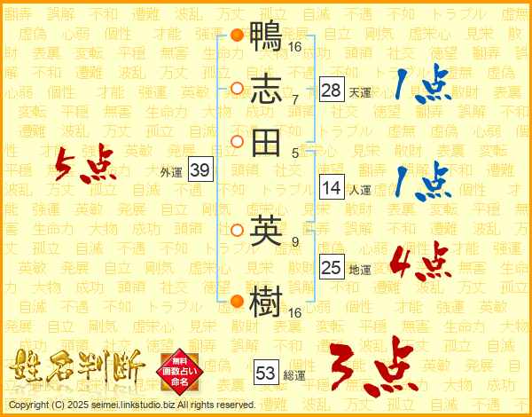 鴨(16画)志(7画)田(5画) 英(9画)樹(16画)