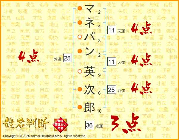 マ(2画)ネ(4画)パ(3画)ン(2画) 英(9画)次(6画)郎(10画)