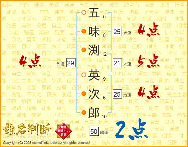 五(5画)味(8画)渕(12画) 英(9画)次(6画)郎(10画)