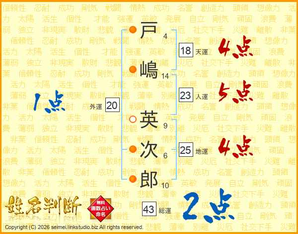 戸(4画)嶋(14画) 英(9画)次(6画)郎(10画)