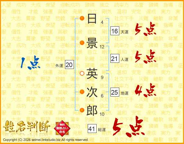 日(4画)景(12画) 英(9画)次(6画)郎(10画)