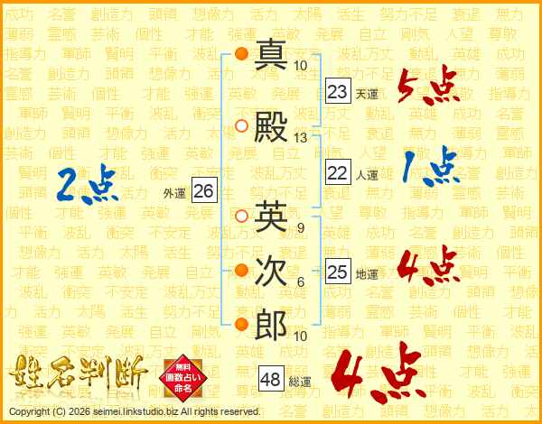 真(10画)殿(13画) 英(9画)次(6画)郎(10画)