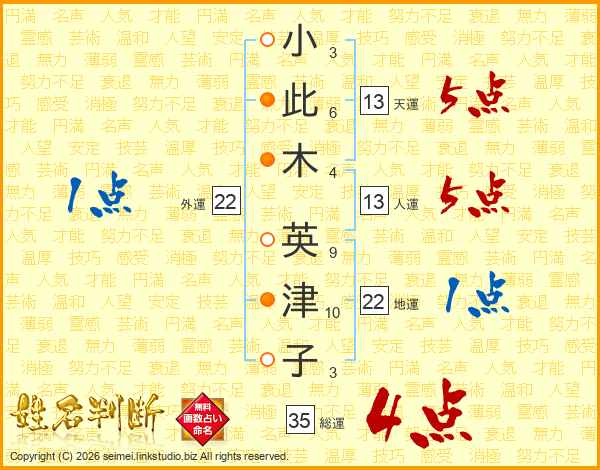 小(3画)此(6画)木(4画) 英(9画)津(10画)子(3画)