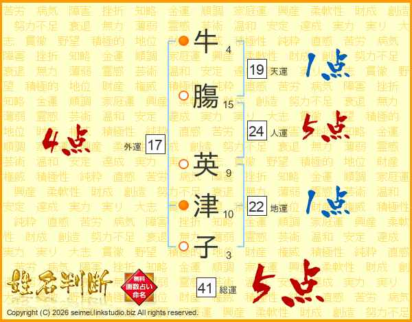 牛膓英津子さんの総運は41画の5点!