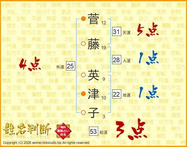 菅(12画)藤(19画) 英(9画)津(10画)子(3画)