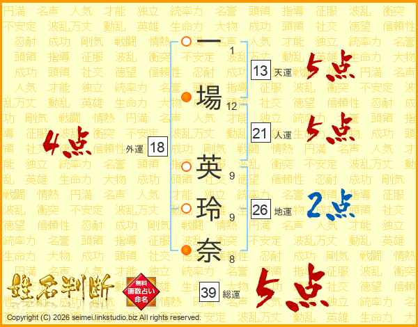 一(1画)場(12画) 英(9画)玲(9画)奈(8画)