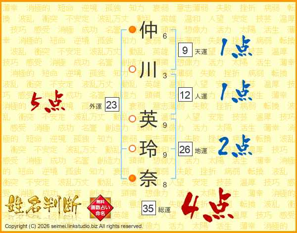 仲(6画)川(3画) 英(9画)玲(9画)奈(8画)