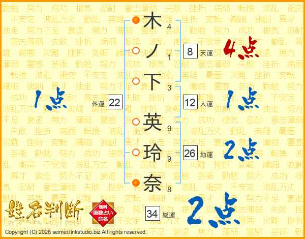 木(4画)ノ(1画)下(3画) 英(9画)玲(9画)奈(8画)