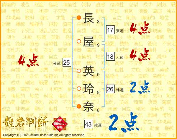 長(8画)屋(9画) 英(9画)玲(9画)奈(8画)