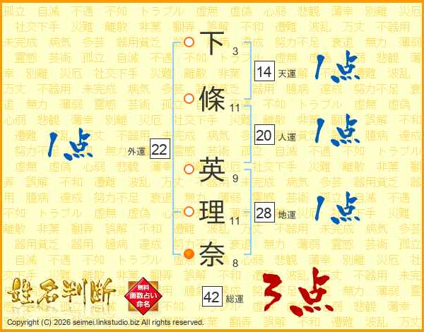 下(3画)條(11画) 英(9画)理(11画)奈(8画)