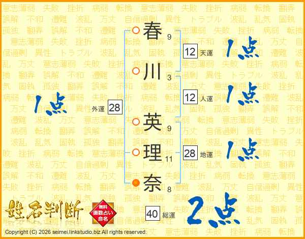 春(9画)川(3画) 英(9画)理(11画)奈(8画)