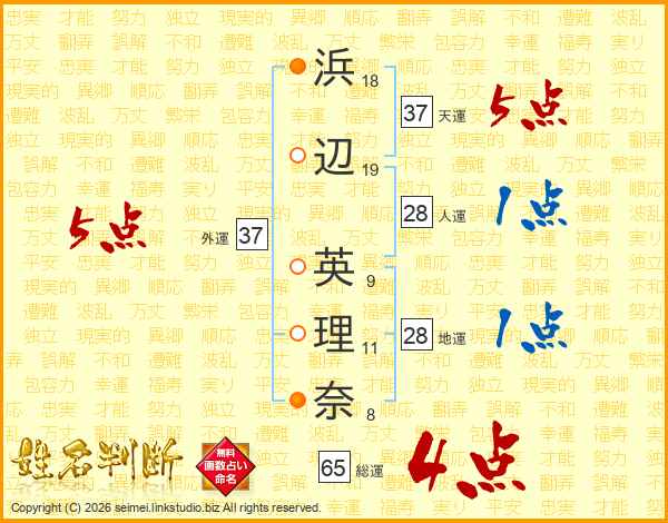 浜(18画)辺(19画) 英(9画)理(11画)奈(8画)