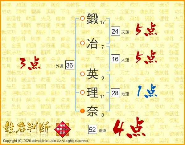 鍛冶英理奈さんの総運は52画の4点!