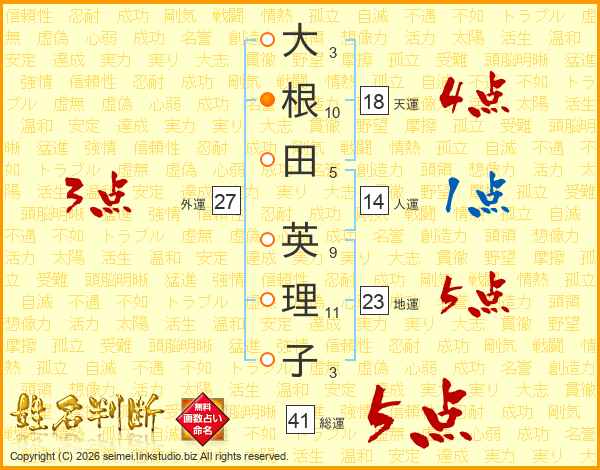 大(3画)根(10画)田(5画) 英(9画)理(11画)子(3画)