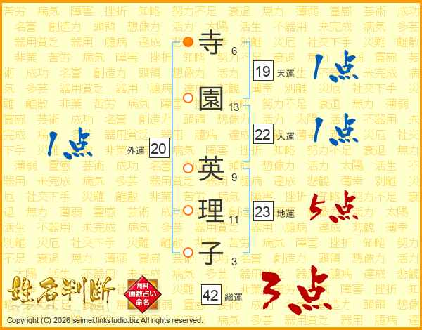 寺(6画)園(13画) 英(9画)理(11画)子(3画)