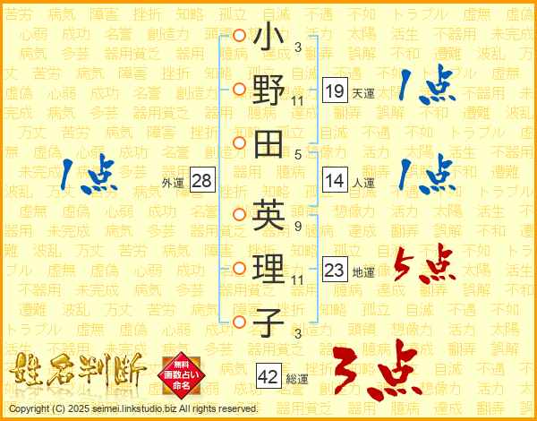 小(3画)野(11画)田(5画) 英(9画)理(11画)子(3画)