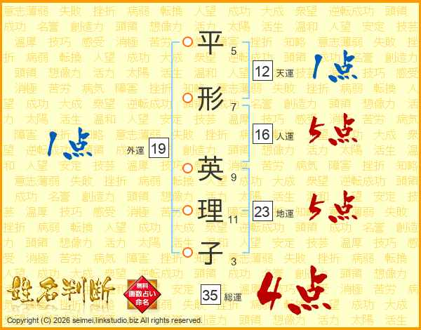 生活面を象徴する運勢です。外部から受ける影響力を表し、結婚運、家庭運や職場、環境への順応性を表します。総運から人運を引いた画数。姓や名が1文字の場合を除く。